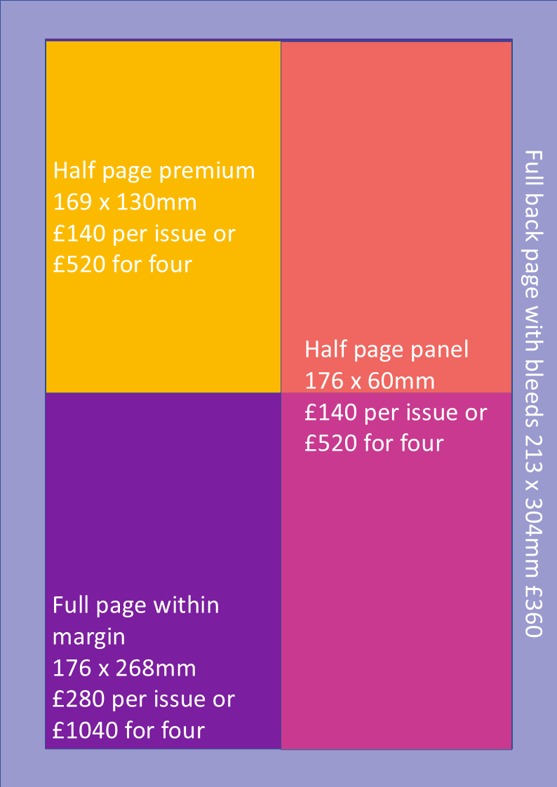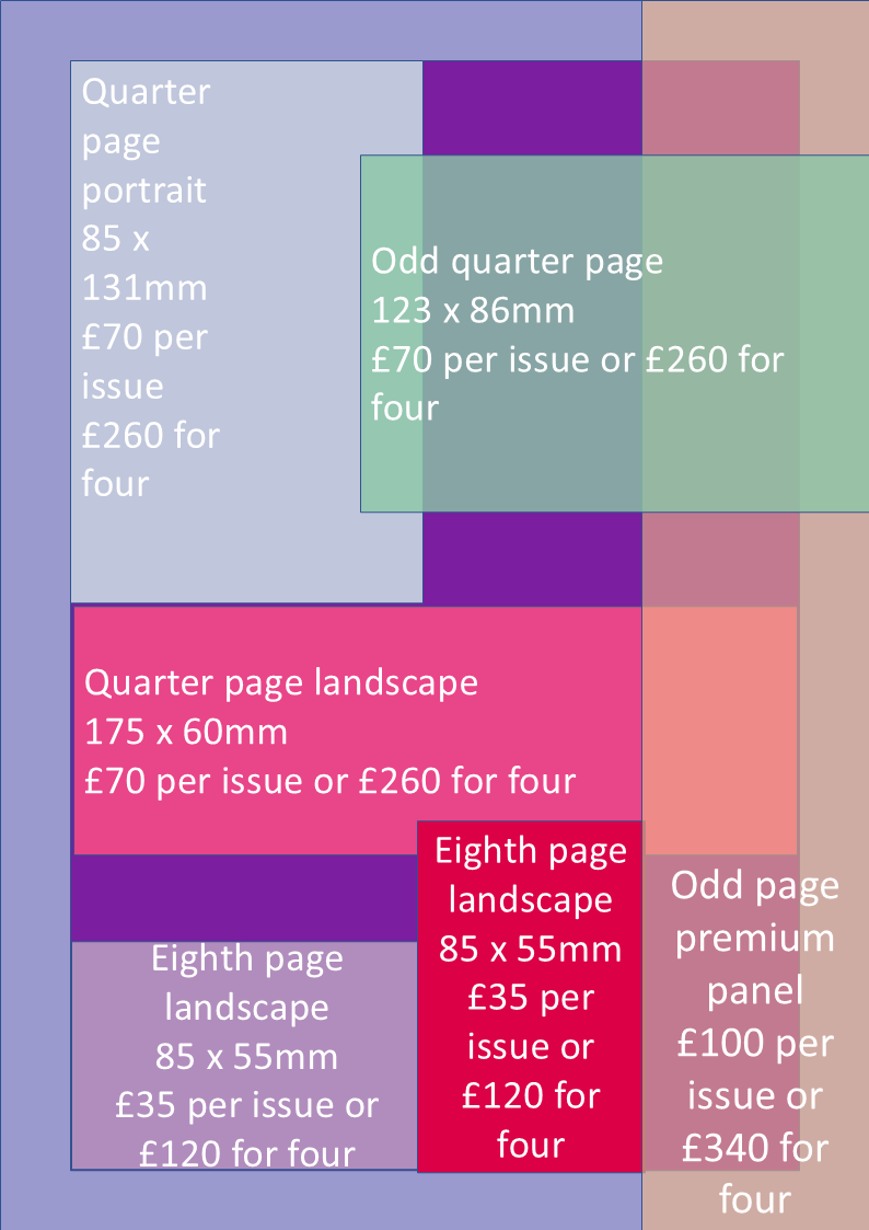 See our rate card for available sizes and current pricing. Only high-resolution .jpg or print-quality .pdf files are acceptable formats, and for printing purposes, it is best if the advert is at least 300dpi. Please contact us if you have any questions.
