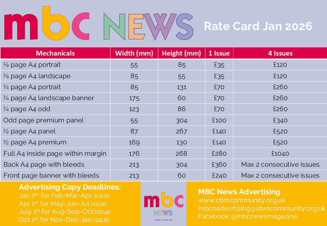 Please contact us at mbcnadvertising@cbmcommunity.org.uk with any queries. You can email us your advert artwork or for larger files please use the upload form on the right (one file per upload).